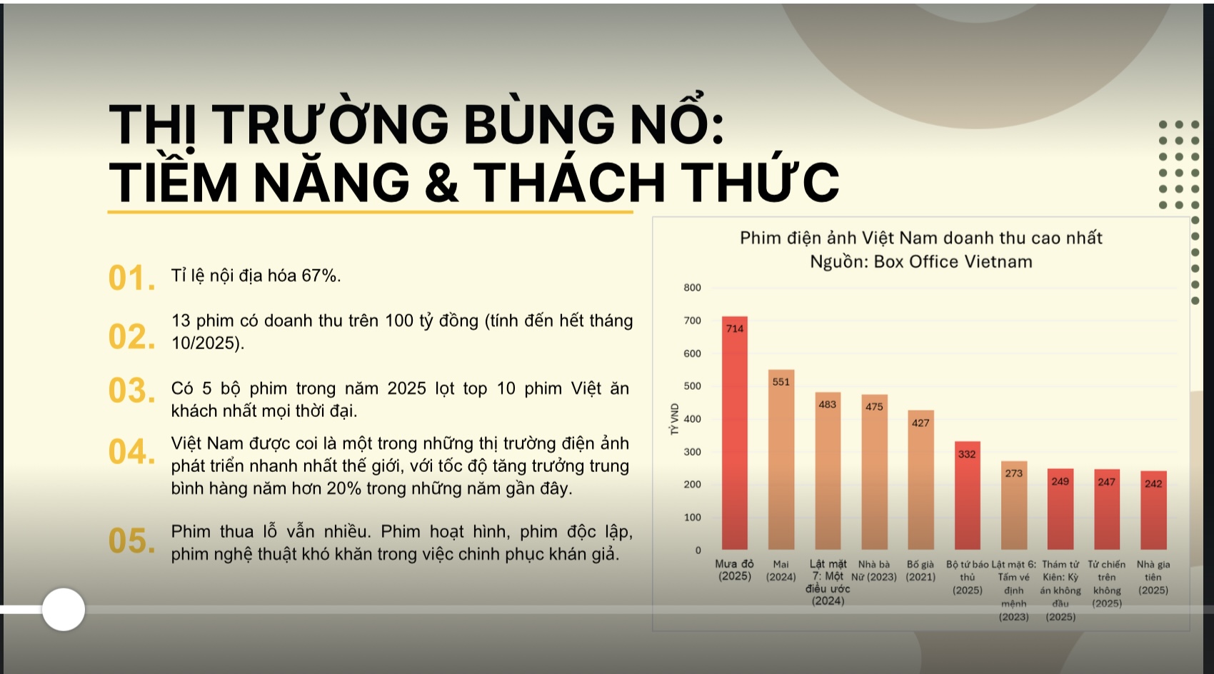 Trong lĩnh vực điện ảnh, sau những cơn sốt vé và doanh thu ấn tượng của điện ảnh Việt Nam thời gian gần đây, GS.TS Trần Thanh Hiệp và nhà phê bình, nhà báo Lê Hồng Lâm đều thống nhất rằng: hiện nay là “thời cơ vàng” để điện ảnh Việt Nam cất cánh với rất nhiều tiềm năng và tín hiệu tươi sáng. Việt Nam là một trong những thị trường điện ảnh phát triển nhanh nhất thế giới,với tốc độ tăng trưởng trung bình hàng năm hơn 20% trong những năm gần đây. Năm 2025 đang trên đường trở thành năm thành công rực rỡ cả về mặt doanh thu (đang hướng tới mốc doanh thu cao nhất lịch sử trong một năm dương lịch) lẫn về mặt nghệ thuật với nhiều tác phẩm ghi dấu ấn đậm nét. Về bối cảnh sản xuất, đầu tư tài chính, hệ thống phát hành, hệ thống rạp chiếu đều có bước tiến vượt bậc.